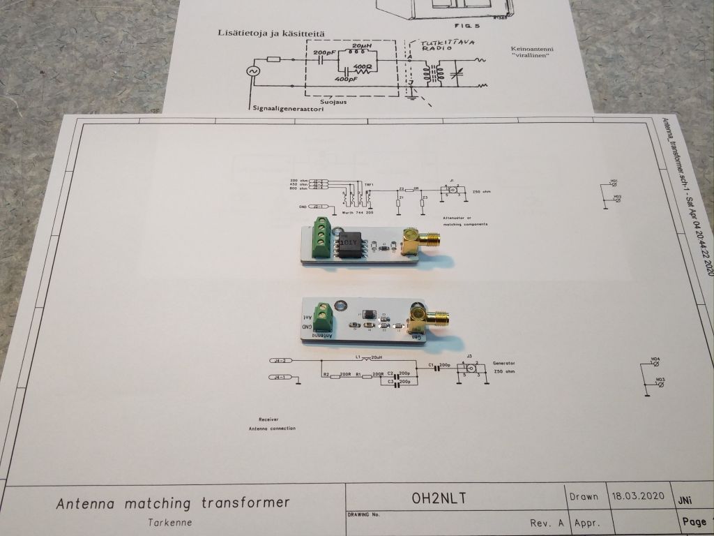 Modullaattorin kaveriksi ja yleisesti mittausten apuvälineeksi tein pari pikkukorttia. Ensimmäinen on samanlainen muuntaja mikä on mahdollista kalustaa modulaattorikortin kulmallekin. Erillinen muuntajakortti voi joskus olla hyödyllinen jos modulaattorin ja radion välillä on pitkä kaapeli. Laittamalla impedanssi sovitus radion taakse voidaan käyttää 50ohmin koaksiaalikaapelia kytkentään.