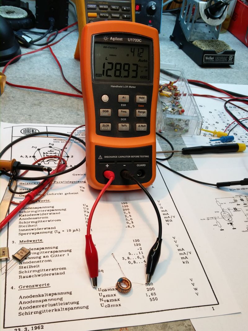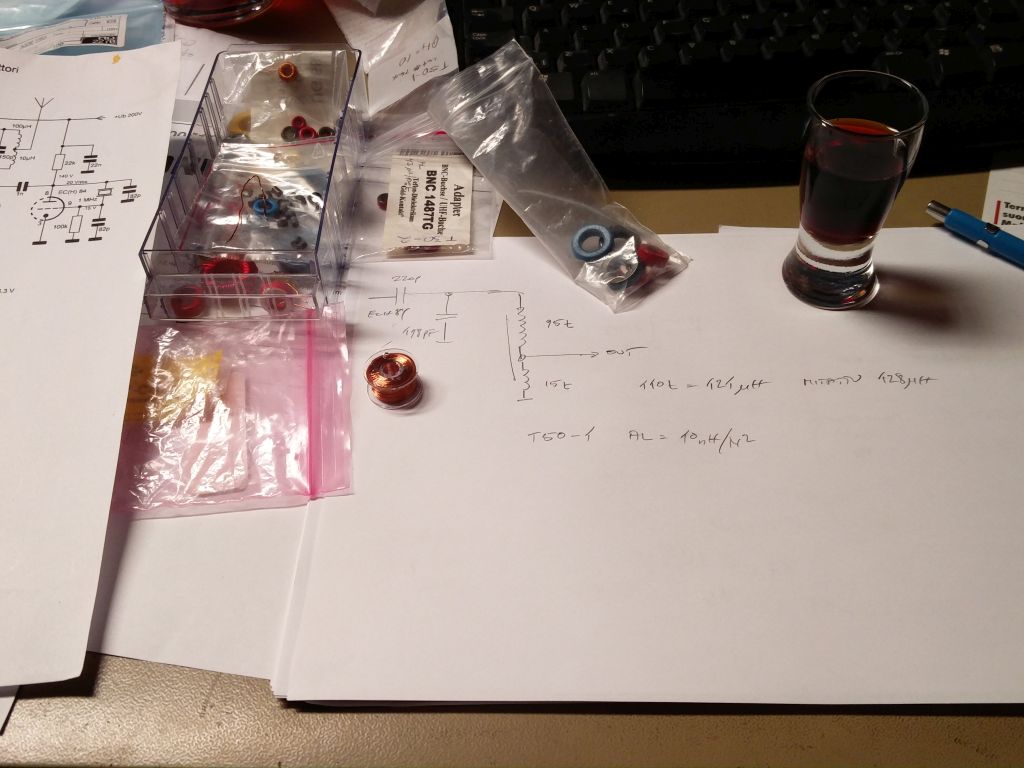 T50-1 rautajauhetoroidi minkä AL-arvo on 10nH/N^2. Laskin, että 110kierrosta tuottaaisi 121uH. Jako piti olla 10 kierrosta outputtiin ja 100 kierrosta siitä anodille. Langan mittaus meni senvarta perseelleen, että suhteeksi tuli 15 / 95 kierrosta. No ei se niin tarkkaa ole. Mitattu induktanssi 128uH. Resonanssikonkan arvoksi pitäisi tulla 198pF.