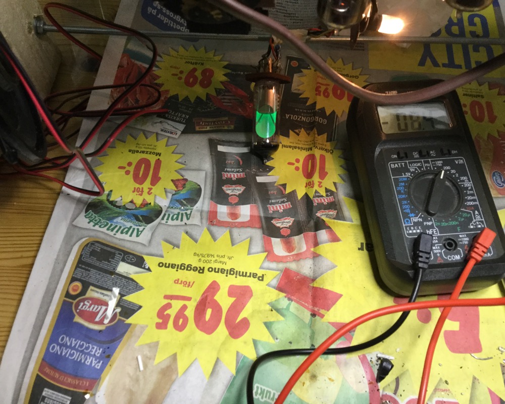 Nyt kuitenkin laite soi kohtalaisesti. Hieman vaimea ääni, eli potikka saa olla täysillä. Vaihdoin EABC80 toiseen käytettyyn. Vaikutti kyllä ääneen. Mittailin vastuksia ja näyttää siltä, että yksi vastus on poikki, kuten Jussi arvelikin. Ohitin tuon vastuksen ja tadaa ! EM80 hohtaa kuin viimeistä päivää.