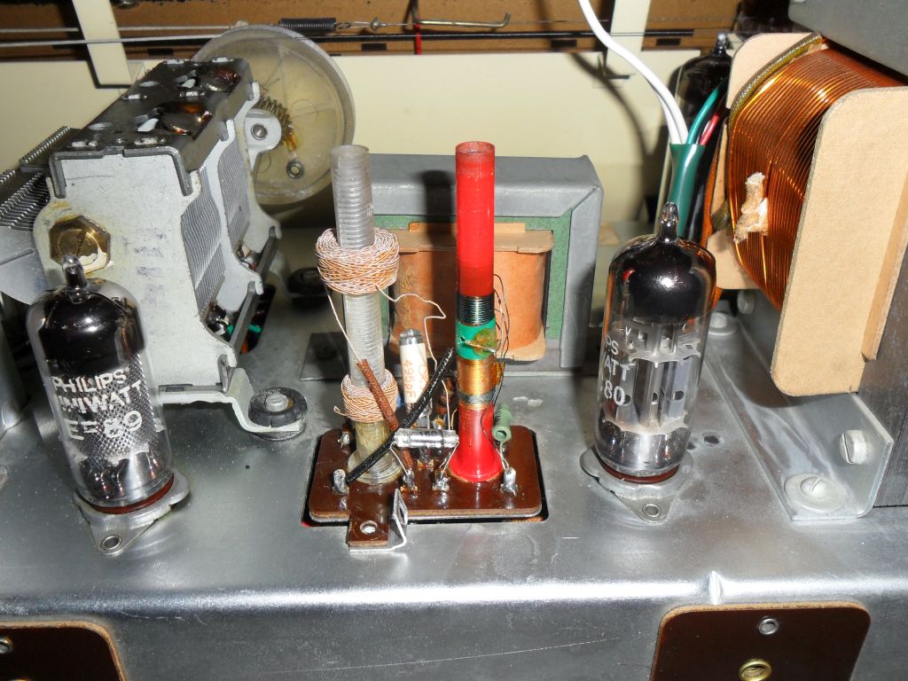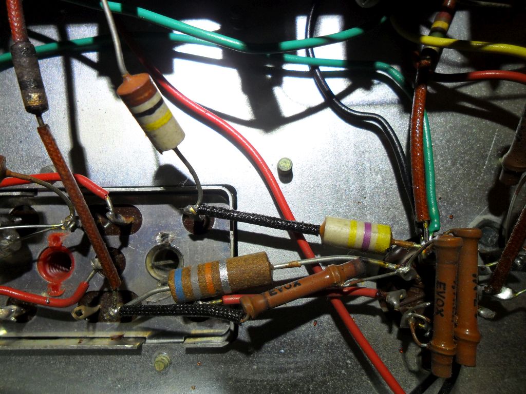 Vaihdoin radioon EF89 putken tuon väärän tilalle. Näyttää olevan yksi vastus palanut, jopa osittain hiiltynytkin, mutta ei poikki. 1 kohmin tehovastukselta tulee jännite palaneelle vastukselle, josta se kelapurkin kautta jatkaa 68 kohmin vastukselta EF89 pinnille 8.