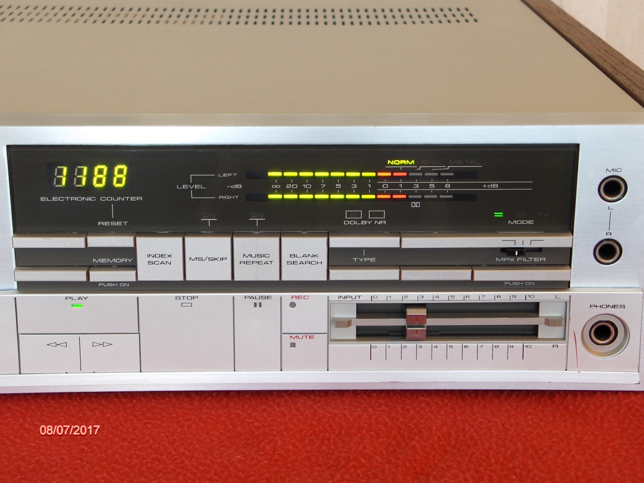 Olen siistinyt ulkoisesti laitetta myös melkoisesti. Etupaneelista sain hiottua kaikki pahimmat jäljet pois. Onneksi noissa alumiinisissa napeissa ei ollut mitään ruhjeita, vaan lähtivät puhdistuksella puhtaiksi. Samaten kasettiluukun kannesta tuli erittäin hyvä kun siitä lähti tuo hintalapun jättämä liimapinta pois.