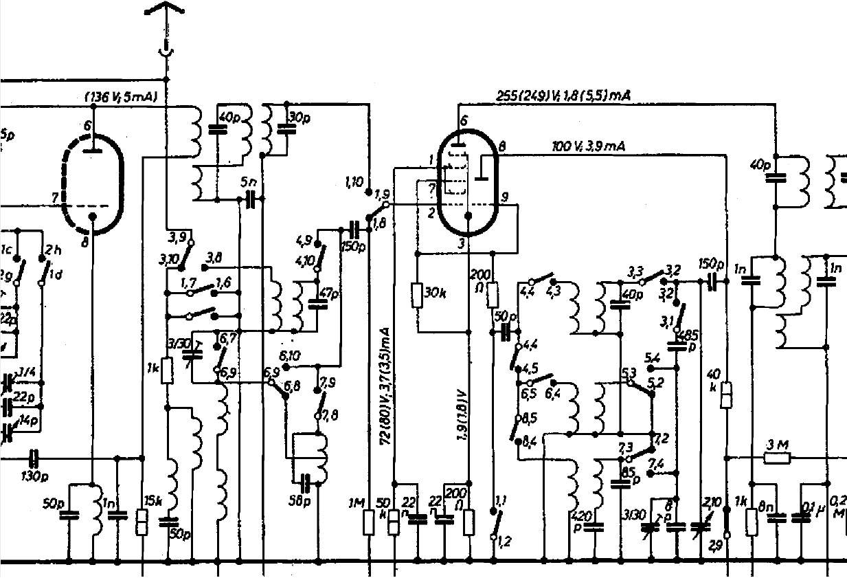 Radiossa on kuitenkin kaksoiskonkka ja oskillaattoripuolella se onkin kytketty normaaliin tapaan. Luulisi virityskonkan olevan tarpeen jo laajan lyhytaaltoalueenkin vuoksi. Lieneekö sitten piirustusvirhe? En kuitenkaan nyt viitsi ryhtyä tutkimaan, kuinka tuo kytkentä "luonnossa" esiintyy. Tuo etupiirien kelakombinaatiokin vaikuttaa melko erikoiselta.