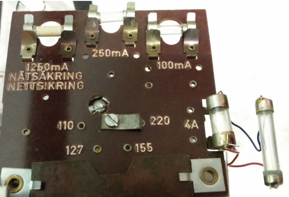 Vielä tuosta 4A hehkusulakkeesta, kooltaan se on vähän paksumpi (8 x 20 mm) ja kiinnitetty tinaamalla kuin nuo muut levyllä olevat sulakkeet (5 x 20 mm) ovat kiinnikkeissään kiinni. Minkä takia tinaamalla kiinnitetty, eikö ole ollut siihen aikaan sopivaa sulakepidikettä?