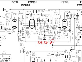 Sitten pitäisi saada selville etupään ottama virta, jotta sarjavastuksen arvon voi määrittää. Vain ECC81:n käyttöjännite on tarpeen stabiloida. Jos kytkentätekniset syyt edellyttävät, niin voi EC92:n ottaa mukaan tähän stabiloituun jännitteeseen.