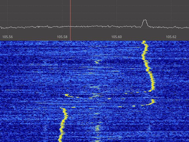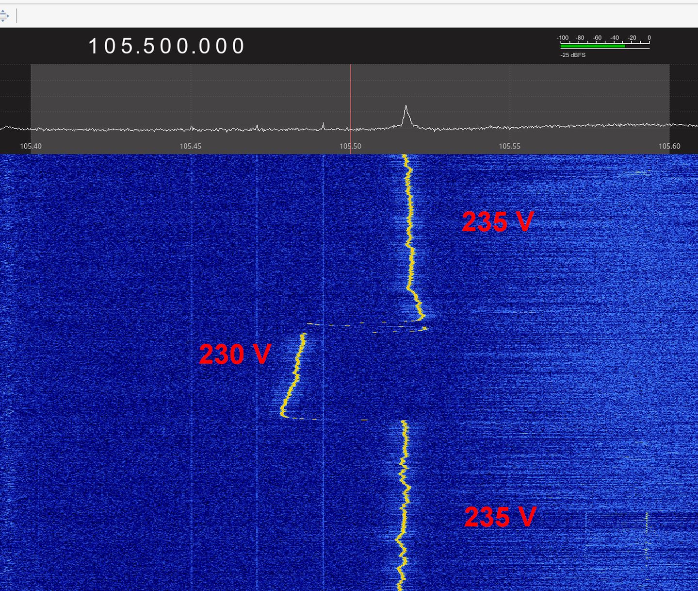 Saloran tutkiminen on jatkunut ja syy tuohon ilmaisinvirityksen yliherkkyyteen taitaa olla selviämässä. Radiota kuunnellessa kun asemaviritys tuntui siirtyilevän aina välillä ihan omia aikojaan. Ajattelin ensin, että kyse saattaisi olla komponenttiviasta, mutta sitten kokeilin seurata Saloran oskillaattoritaajuutta tuollaisella SDR-donglella ja siinähän tuo taajuuden vaihtelu näkyikin selvästi. Laskennallinen taajuus pitäisi olla 105,500 MHz (Yle Eurajoki 94,8 oli kuunneltavana). Tuo vaihtelu oli tietyllä lailla systemaattista kuitenkin joten tuli mieleen seurata verkkojännitettä tuossa rinnalla. Sieltähän se syykin sitten löytyi, jännite vaihteli hyppäyksillä välillä 226 - 235 V säännöllisen epäsäännöllisesti. Tuossa liitekuvassa vaihtelu oli 230-235 V.