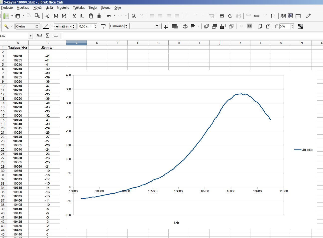 Kiinanihme funktiogeneraattori FeelTech FY2300S syöttää siniaaltoa (200 mV antotasolla) 56 pF konkan kautta ilmaisinta edeltävän vt-putken (EAF42) hilalle. DVM mittaa jännitettä kuvan esittämistä paikoista. Taajuuden askellus 5 kHz välein ja taajuus/jänniteparit taulukkolaskentaohjelmalle talteen ja siitä kuvaksi.