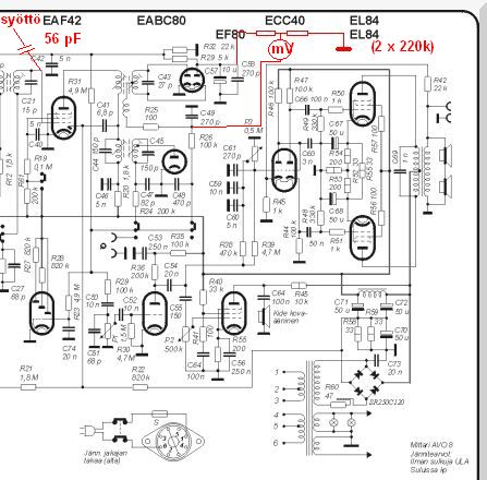 Katselin tuota toteutusta alapuolelta, kyllä nuo ECC81 molempien puoliskojen anodijännitteet voi tuolta suhteellisen helposti ottaa muista erilleen.