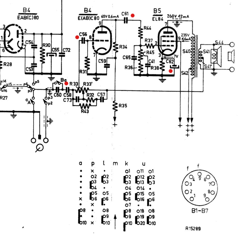 Mulla ei nyt ollut tuon radion kaaviota, mutta tästä on kyllä apua - noi punaisella pallukalla merkityt kannattaa vaihtaa aluksi. C58 ja C61 on 33 nF (500 tai 630 V), C56 on 4,7 nF mutta 22 nF käy (500 tai 630 V), C62 on 100 uF (mikrofaradia) 63 tai 100 V.