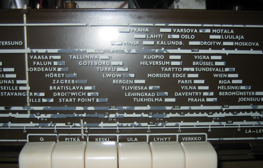 Alla on kuva Salora 810V:n asteikkolasista josta nuo maalaukset ovat lohkeilleet pois. Jouduin ottamaan tuon asteikkolasin koneistosta irti koska tausta oli paksun pölyn peitossa ja lasia irroittaessa nuo maalinhilseet irtoilivat lasista ihan itsestään. Irronneesta maalista jäi lasiin kuitenkin tuollainen jauhomainen jälki joka sekin kyllä lähtee pyyhkimällä pois (ei parane koskea).