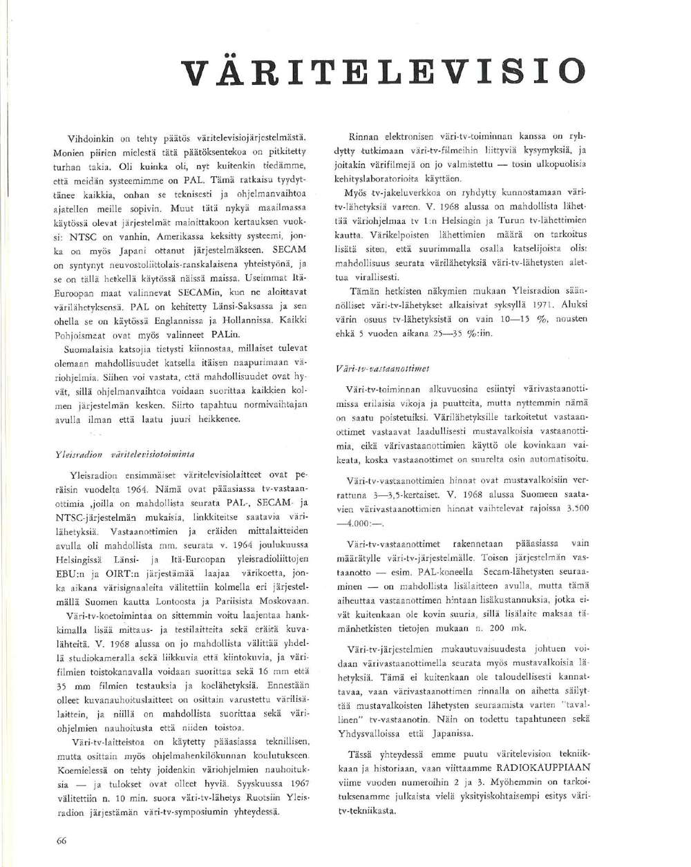 Joukossamme on monia väritelevision alkuvaiheisiin osallistuneita Yleisradion, televisioteollisuuden ja -kaupan piiristä. Olisi kuluvan vuoden aikana mukava kuulla ja lukea muisteloita näistä väritelevision alkuvuosista. Radiot-lehtemme antaa varmaan kirjoituksille tilaa.
