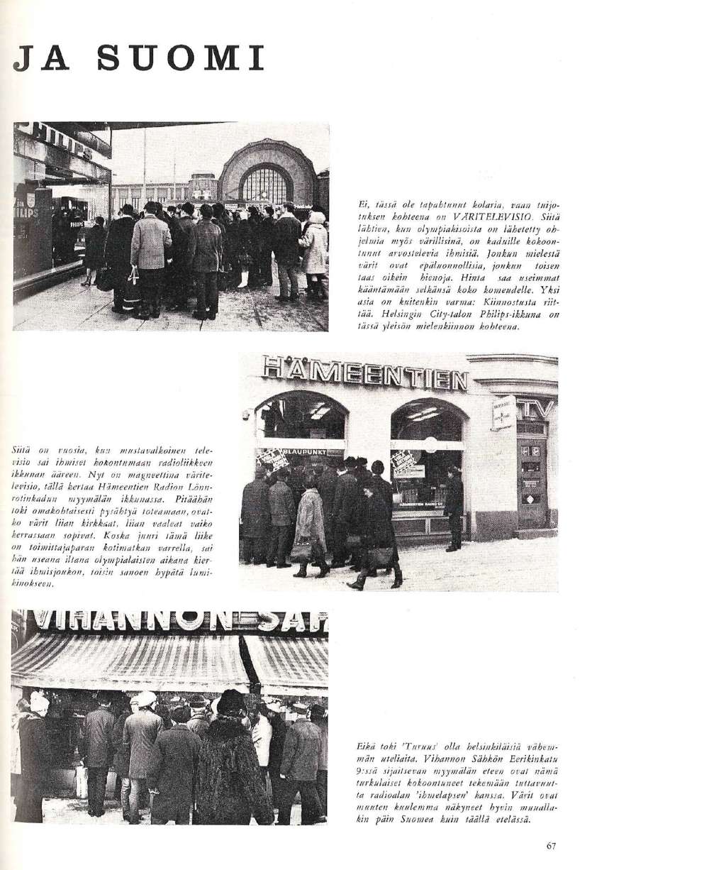 Yleisradio aloitti teknilliset värikoelähetykset heti seuraavan viikon aikana. Ensimmäiset katsottavaa ohjelmaa sisältävät värilähetykset taisivat tulla Grenoblen talviolympialaisista helmikuun alkupuolella 1968. Muistelen, että suurimpien radioliikkeiden ikkunoissa oli väritelevisio, josta olympialähetystä saattoi katsella.