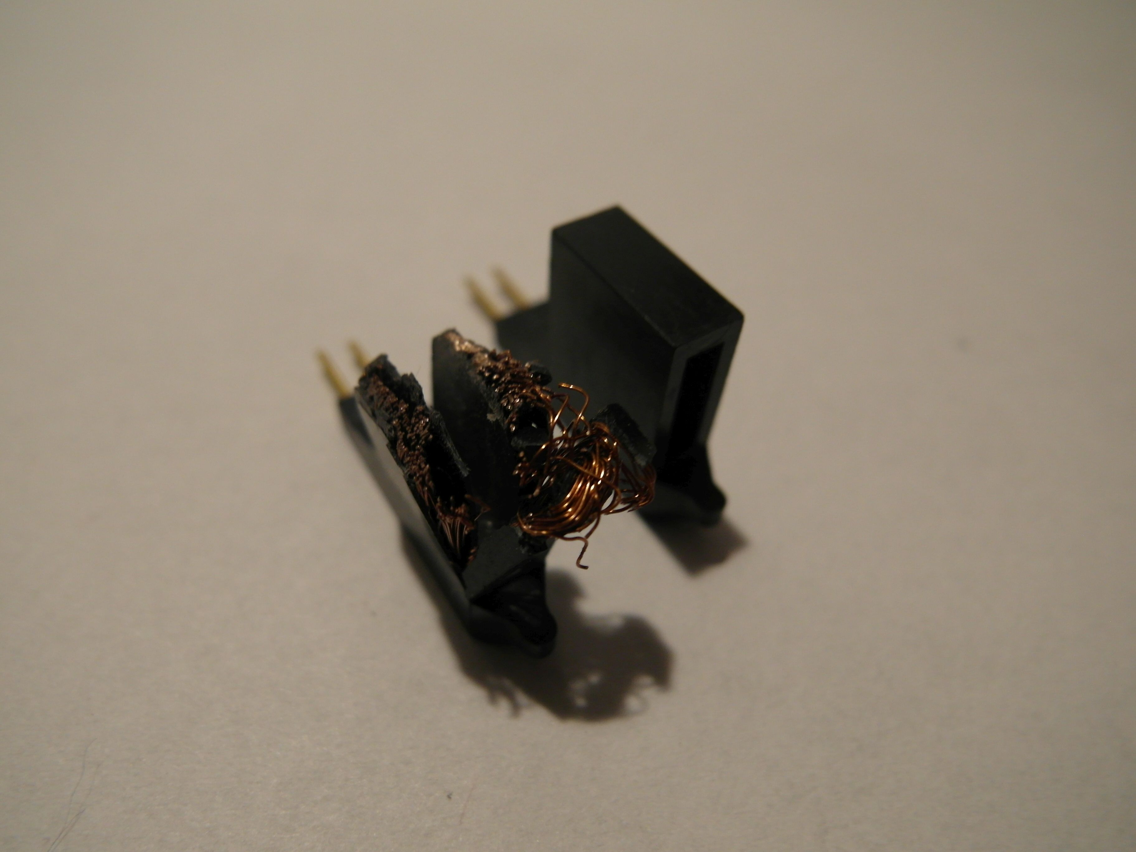 Teurastin yhden komponentin ja sisältä paljastui ohuesta emaloidusta kuparilangasta käämitty kela.