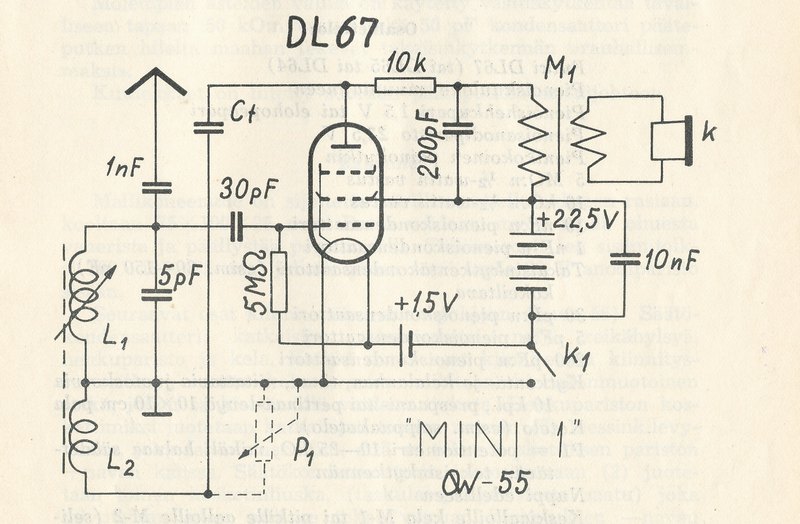 Tästä se lähtee. Melkein minimalistisin putkivastaanotin, mitä kuvitella saattaa. Wiio-Somerikon Taskuradiot kirjassa on sarja subminiatyyrivastaanottimia, joista yksinkertaisin on yksiputkinen Mini 1, ja sarjan huippuna neliputkinen suora Mini 4. Alkuperäisessä oli putkena DL67, tässä kokeillaan hiukan isompaa Raytheonin 5678 pentodia. Ihan saippuarasiaan en yritäkään tätä rakentaa, mutta kytkentää on tarkoitus jäljitellä mahdollisimman tarkasti, paitsi ajattelin käyttää kunnon säätökondensaattoria ferriittisauvavirityksen sijaan. Mutta on mukava kokeilla, mihin yksi pikkuputki yltää.