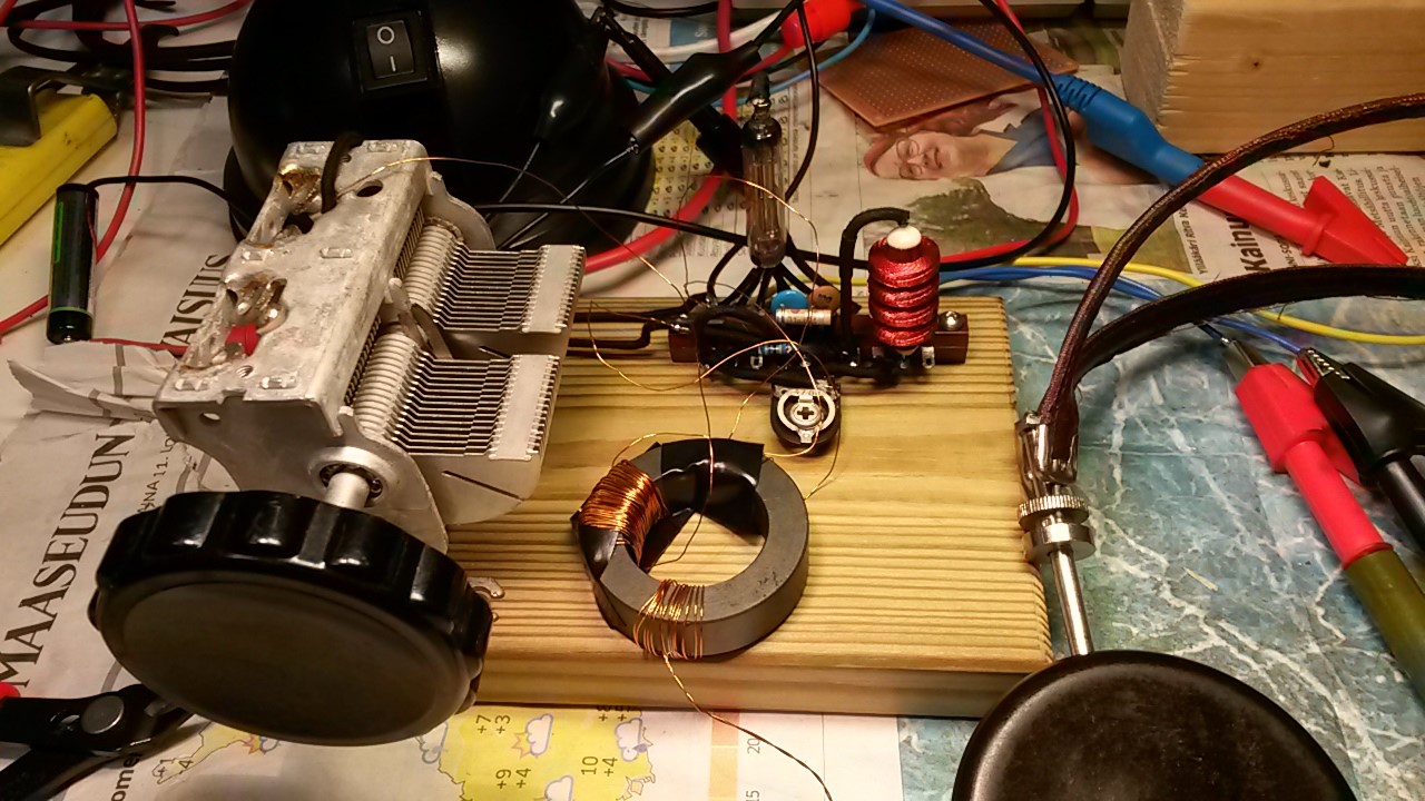Tämähän alkoi soida. Kengurutaskumalli siitä sitten tuli. Pitkille aalloille päästiin noilla osilla. Kela on noin 5mH ja 500pF kaksikosta on toinen puoli käytössä.