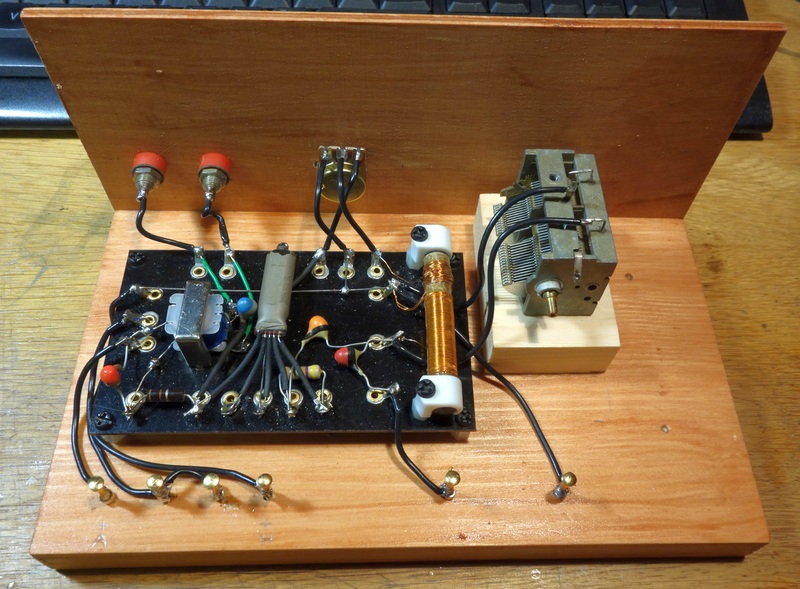 Sitten parannuskohteisiin. Takaisinkytkentäkelan kierroksia täytyy vähentää, nyt säätö on kovin äkkinäinen. Antennikytkentänä voisi kokeilla parin kierroksen linkkikelaa, minulla kun on vakioantennina koaksiaalisyöttöinen aktiivilooppi. Sitten se anodivastuksen vaihto kuristimeen. Päätemuuntaja on ehkä turha 4000 Ohmin kuulokkeille. Nyt siinä on kiinalainen transistoreille tarkoitettu vaiheenkääntömuuntaja, jonka impedanssit muka ovat 30k/1kohmia, tiedä sitten noista. Ensiön induktanssi on kyllä reilut 3 Henryä, joten ehkä nuo arvot ovat sinne päin.