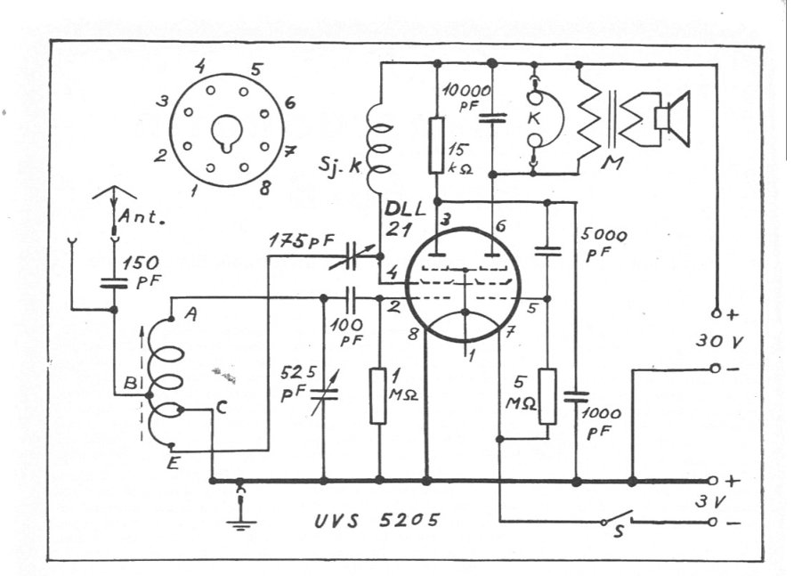 Tämmöinen se on nyt, kytkentä mahdollisimman alkuperäisenä. Olin tulkinnut kohinaa väärin, kun kytkin radioon signaaligeneraattorin, en saanut mitään kuuluviin, kun laite kohisi. Sen sijaan kun takaisinkytkentää vähennettiin, alkoi jotain kuuluakin. Herkällä kädellä sieltä sai semmoisen 100 uV signaalin kuulumaan, mutta takaisinkytkennän säätö on kovin äkkinäinen. Mutta radio siis toimii, kuuluu jo 20 V:n anodijännitteellä, mutta äänenvoimakkuus lisääntyy merkittävästi kun jännitettä nostetaan 30 Volttiin.