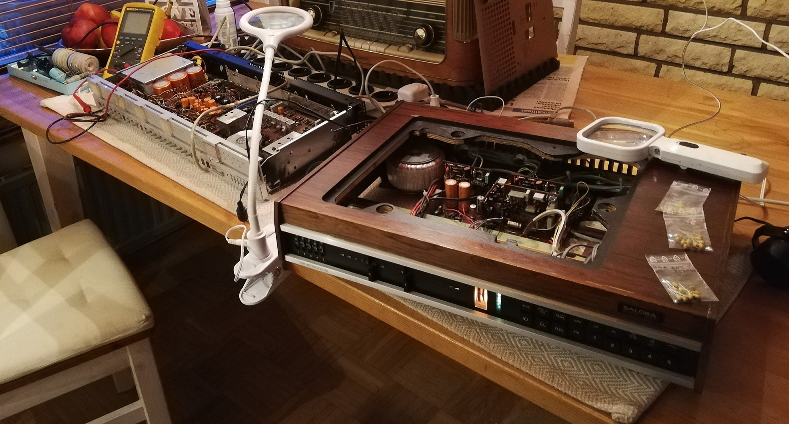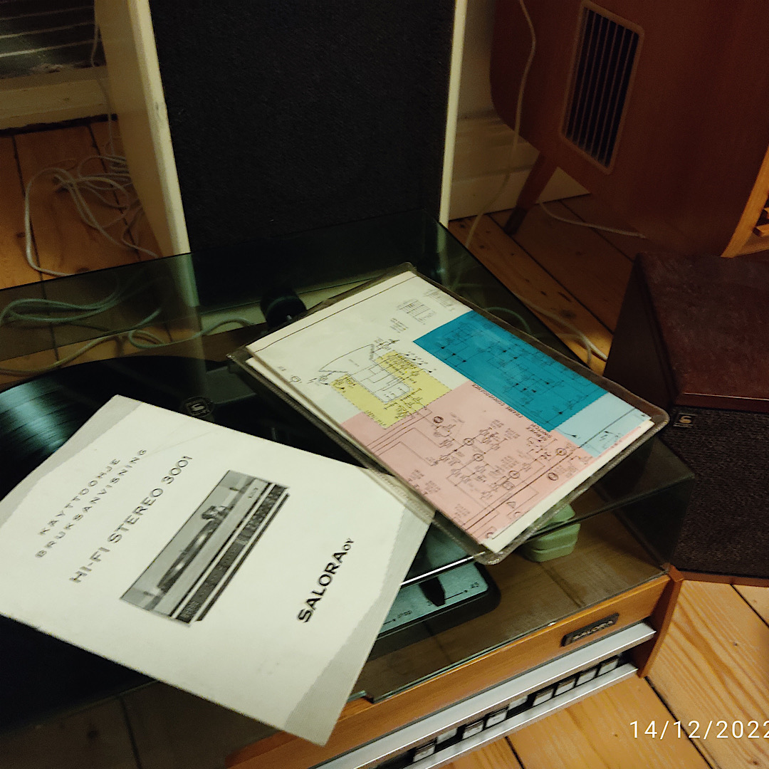 Hauska yksityiskohta .alkuperäinen manuaali ja scema olivat orkkistaskussa. Mukana oli myös Salora Väri TV manuaali.