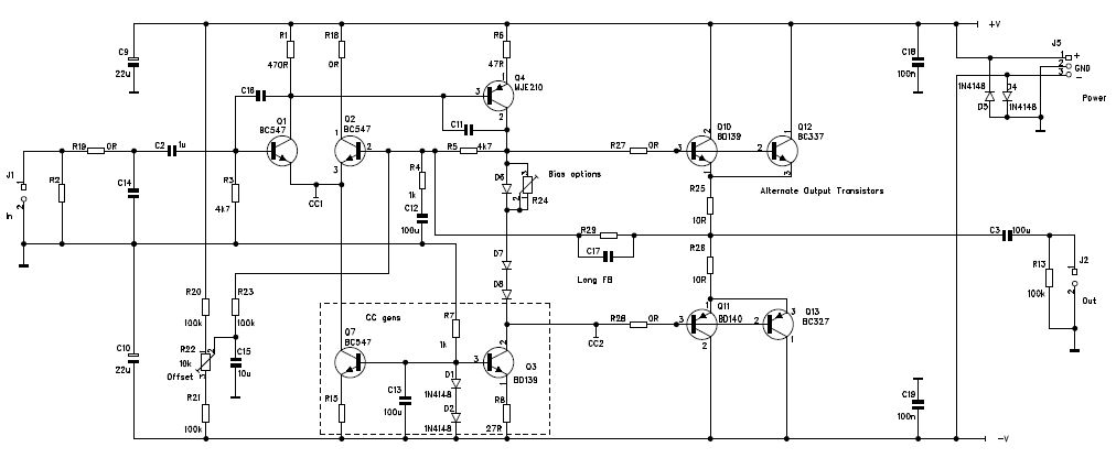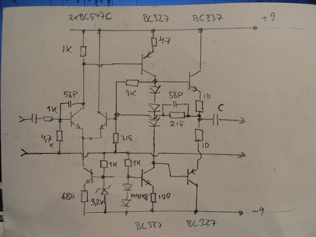 Sitten kokeilin sitä alkuperäistä kytentää näillä BC327/337 trankuilla (=paremmat). Kytkentä lähti värähtelemään ilman kuormaa . Piti lisätä 56pf Konkka BC327'n BC välille. Nostin myös ensimmäisen trankkuparin virtaa 9,3mA'iin (680ohm->470). Nyt tuli hyviä tuloksia. Särö noin 0,007% , joka on oman mittajärjestelmäni rajoilla ... totuus on? (pienempi?)
