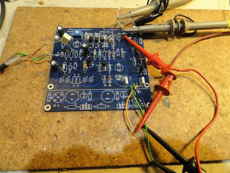 Mielenkiintoinen yllätys oli, että lisäämällä toinen takaisinkytkentäluuppi (kuvan 1K vastus) särö puoliintui. Tuo lisäys sotki hiukan lähdön DC tasoa ja lisäsin lähtoon elkon.