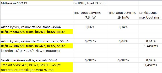Sattui löytymään BC327 ja BC337. Tulokset parani ... särö noin puoliintui. Sitten kokeilin laittaa vakiovirtagenikseksi saman (2diodia ja trankku) ,joka oli siinä omassa. Nostin myös virran samaan 55mA'iin. Tulokset parani edelleen ... parempia kuin Arton simulaatiossa. Tuloksia oheisessa taulukossa