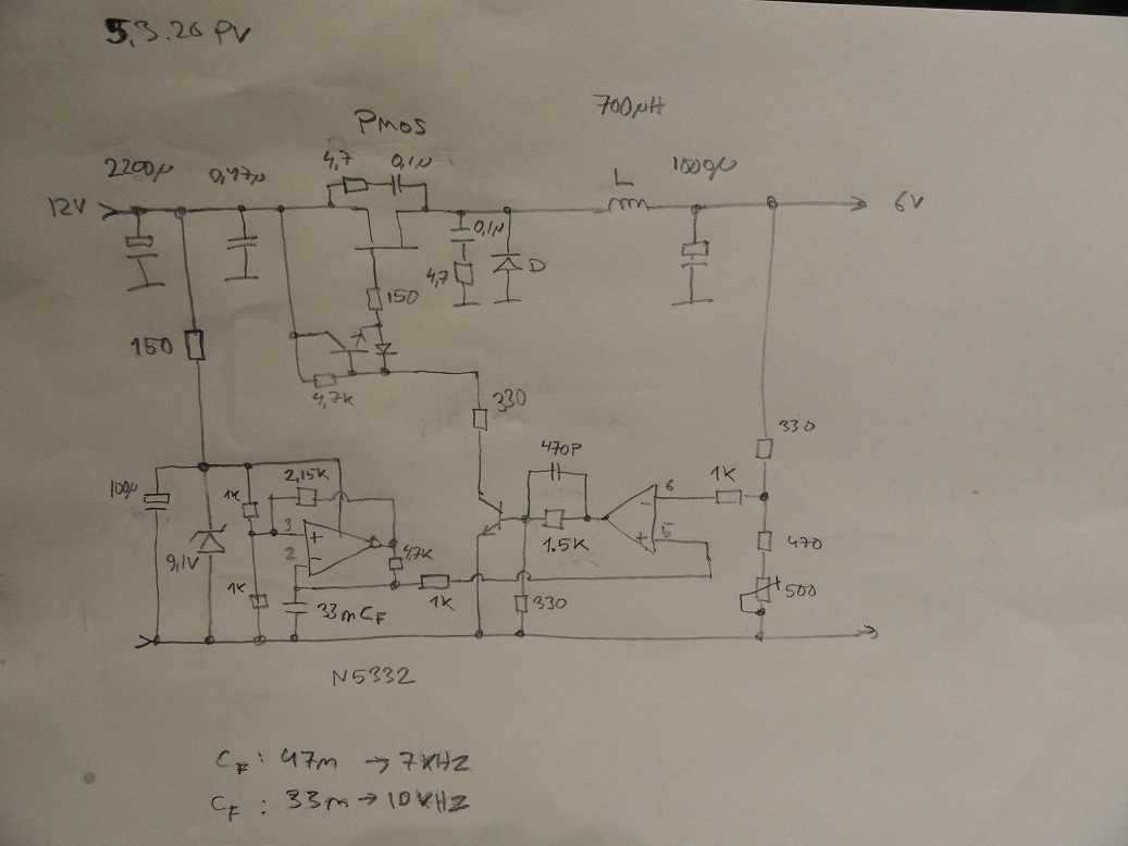 Sain suhteellisen nopeasti kytkennän toimimaan. Laskeva hakkuri toimii siististi, ei piikkejä tehopiireissä. Hyötysuhde 89% . Taajuus on matala .. 7KHz. Häviöitä radion tarvitsemaan hehkutehoa syöttäessä alle 2W .. ei kuumene mistään.