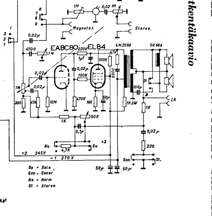 Vika on että ainostaan St asennossa kaiuttimista kuuluu, muissa hyvin hyvin vaimeasti. Radiosta ei kuulunut mitään ennen korjausta, EL84:n hehku oli poikki, ja hila konkka vuoti.