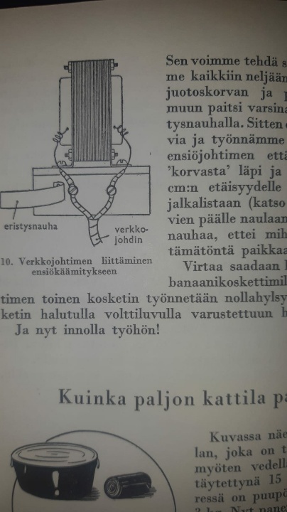 Minulla on tuo sama kirja. Tuota eristysnauhaviritystä olen itsekin ihmetellyt. Jännitteiset ruuvitkin on ruuvattu suoraan puuhun, joka ei ole eriste. Eipä ole rakenteluohjeen muuntajassakaan eristykset kovin kaksiset. Luulisi Sveitsissä sähköturvallisuusasioiden olleen 60 vuotta sitten paremmallla tolalla.