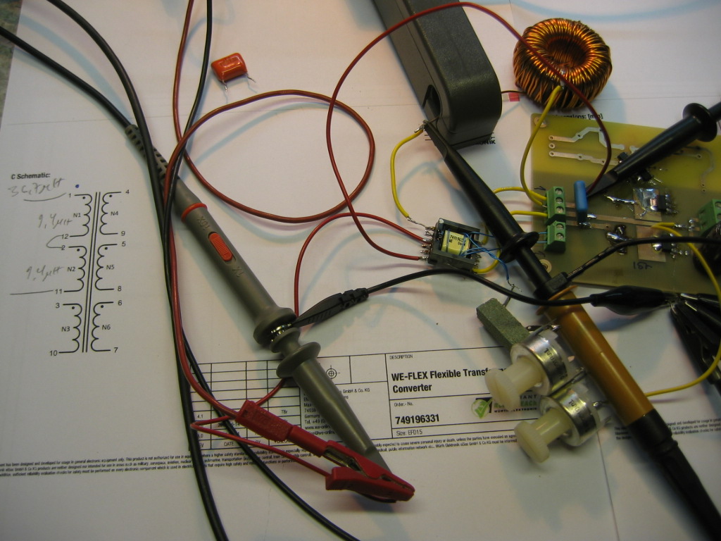 Resonanssikonkan virta on todella suuri. Kun ensiön induktanssi on 2 x 6 µH ja rinnakkaiskapasitanssi 470 nF, niin 23 W lähtöteholla kondensaattorin virta on n. 11 A (p-p).