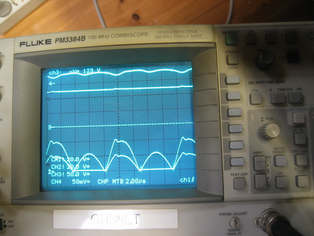 Kuorma luokkaa 25W. Taajuus 30.7kHz vaikka skoopissa näkyy 61.4kHz kun mittaa syöttökuristimen jälkeistä jännitettä. Kanava 3 on kantajännite. Kuvassa näkyy myös aiemmin mainittu haja/johto induktansseista johtuva soiminen.