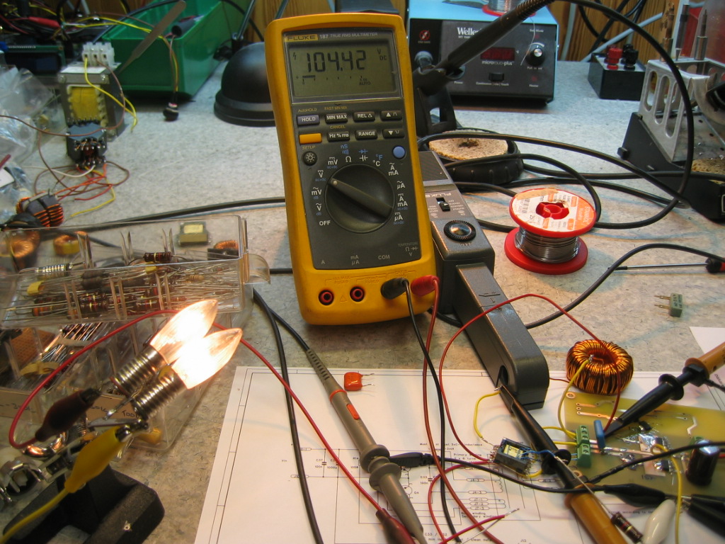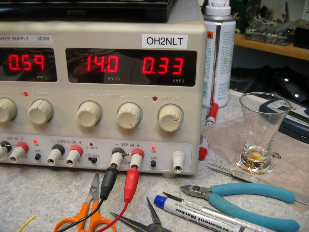 Powerini tuotti niin kauan kaunista sinijännitettä, kun kuormana oli resistanssi, mutta minkään kokoista suotokondensaattoria ei voinut sen lähtöön liittää ilman, että lähtöjännite olisi mennyt kanttiaalloksi. Oli rohkaisevaa todeta, että kiinalaisessa on sama "vika".