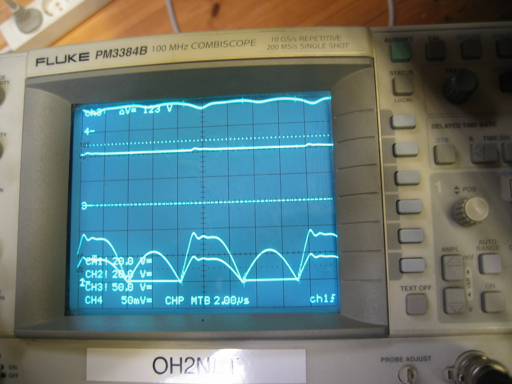 Alla skooppikuvat hakkurin lähdöstä ennen tasasuuntausta, kun suodatuksena on kondensaattori tasasuuntaajan perässä ja choke-input filtterillä.