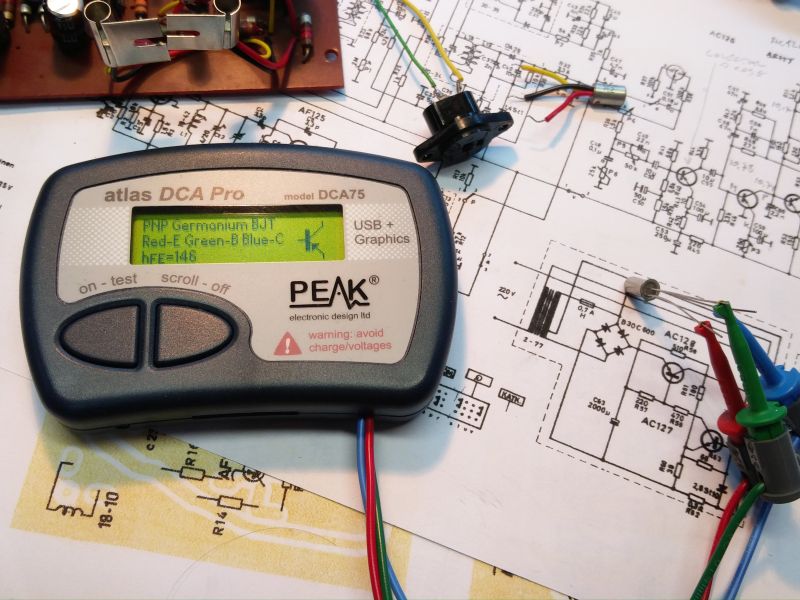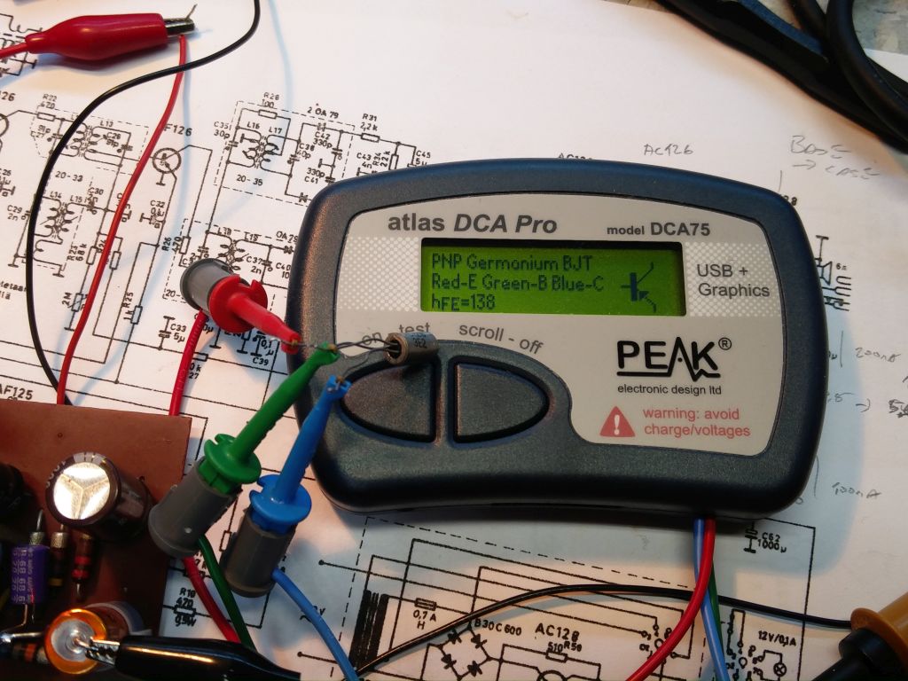 Aloitetaan kakkosen tarina trankusta ja tina (tai muu metalli) viiksistä. Korjausjutut tulee myöhemmin, mutta pääteasteesta löytyi AC126 trankku missä E-C näytti oikosulkua. Korjauksen jälkeen jälleen konjakki-tuumailua. B-E ja B-C kynnykset näyttivät normaaleilta. Päätin kokeilla onko kyse viiksistä. EBC yhteen. Tämän ja kuoren väliin konkasta 16V. Virtamittari ei edes heilahtanut, mutta tuloksena oli toimiva transistori.
