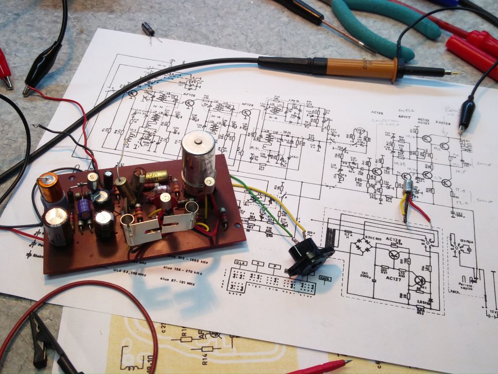Mittailun ja tuumailun jälkeen vika löytyi. Audioasteen toinen trankku kaaviossa merkitty AF117:kaksi, mutta kortilla AC126 E- C oikosulussa. Pääteasteen toimintapiste perseellään ja ei signaalia.