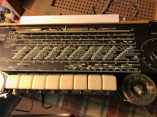 Sähköt on saatu radioon uuden verkkojohdon, tasurin ja konkkien asennuksen jälkeen. Edelliset olivat joko ikääntymisen tai oikareitten seurauksena kaput.