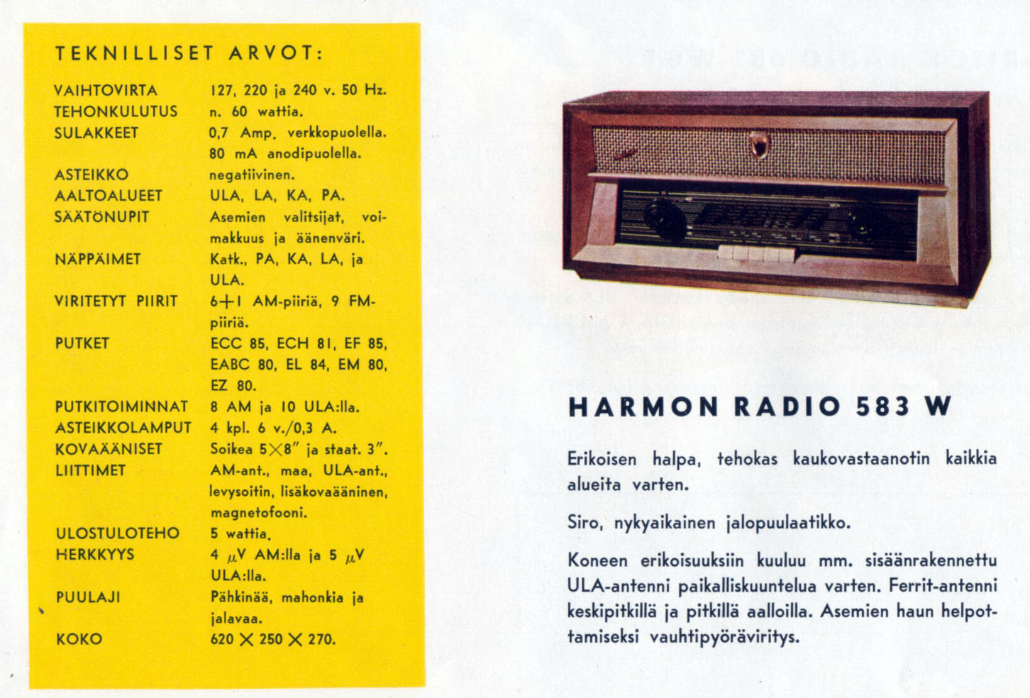 Liitteenä on kuva Yleisradio 90 v. näyttelyä KAVIssa koottaessa kuvaamastani radiosta. Ehkä siitä saa joitakin vihjeitä. Harmon radiomalleissa kovaääniset saattavat vaihdella saman mallisarjan sisällä, joten "alkuperäinen kovaääninen" on niissä joustava käsite.
