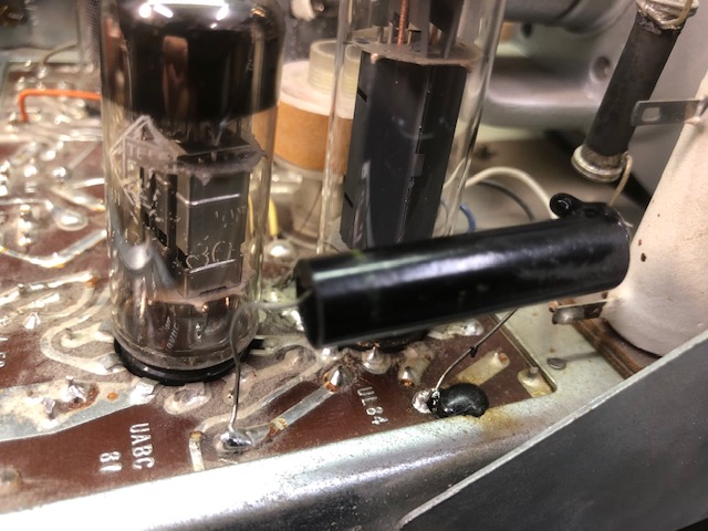 Mikähän mahtaa olla radiossa oleva musta komponentti, josta on vuotanut mustaa mönjää ulos. Näyttäisi, että tuota komponenttia ei ole kytkentäkaaviossa ja siitä on kaikki merkinnät lähteneet pois. Joku on ilmeisesti lisännyt osan väärälle puolelle piirilevyä jälkikäteen. Tuo osa on pääteputken läheisyydessä?