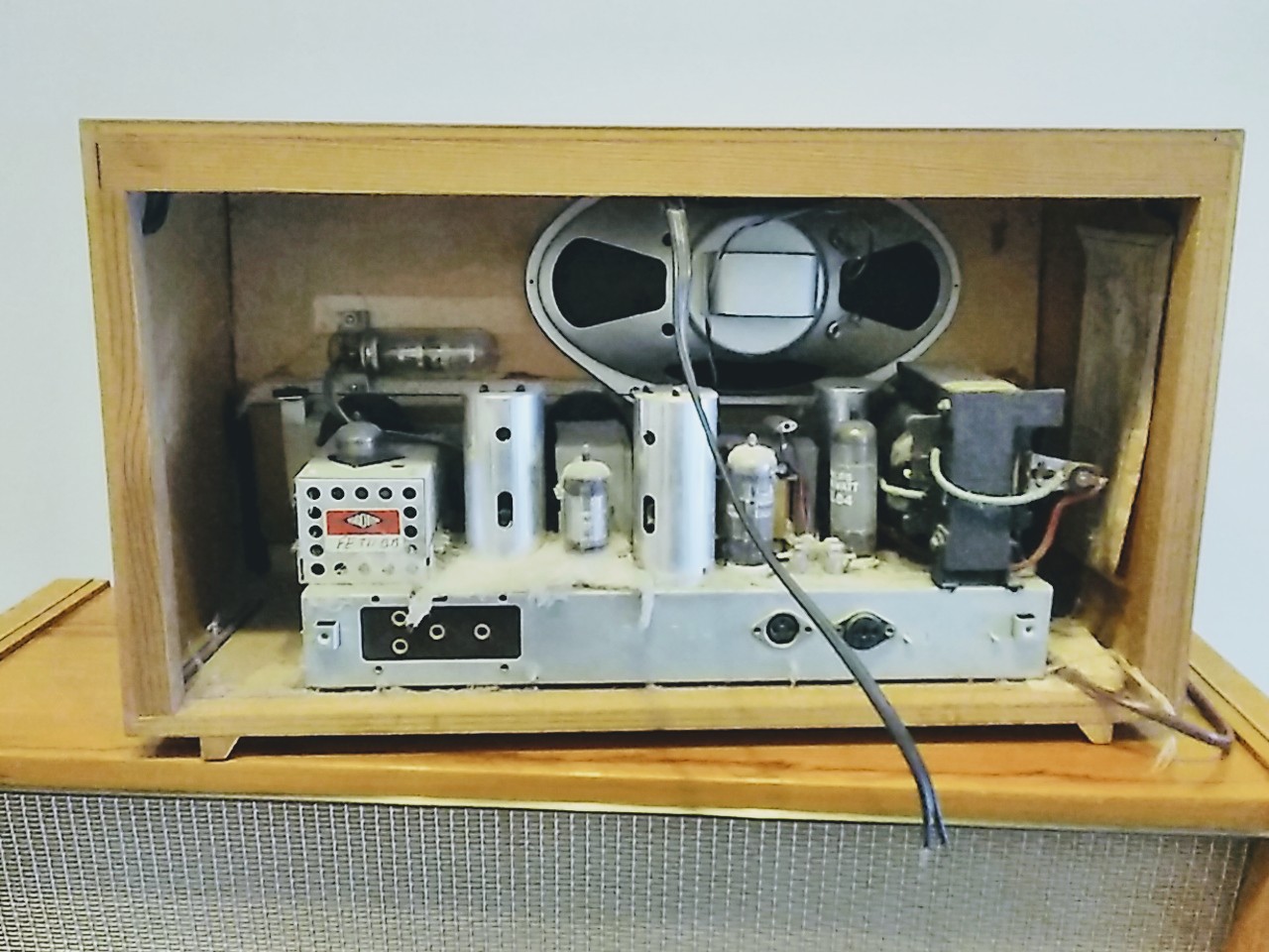 Tässä ei ole kyllä juuri mitään jäljellä.Kun tuo kieleke katkesi (ohutta jousiterästä ?)ja eristeet oli kappaleina,otin tuon keskiniitinkin sitten irti kun se oli löystynyt.Alusta tämä on tähän rakennettava kuitenkin mikäli tämän tyyppisen ratkaisun tähän uudelleen haluaa.Radio toimii kyllä muuten hyvin.
