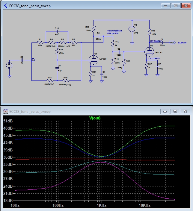 Kun sinulla on yksi ECC83:n puolikas ylimääräisenä, niin kunnollinen kahden potikan tone-aste syntyy helposti.