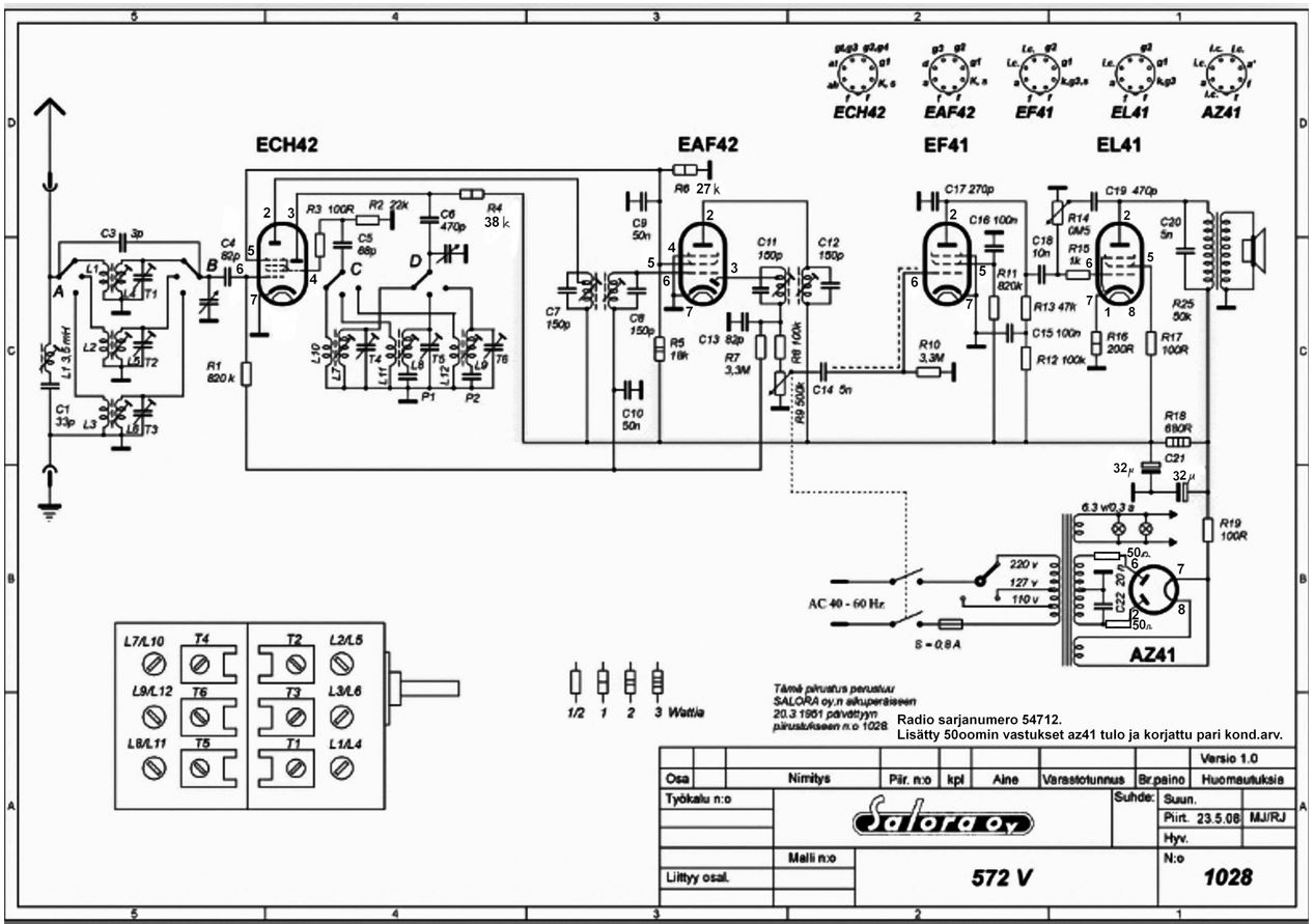 Otin kirpparilta talteen Saloran olympivuoden mallin, josko siitä saisi entisöityä vielä radion. Löytyi uudestaan piirretty kaavio saloran nettisivujen tietokannasta.