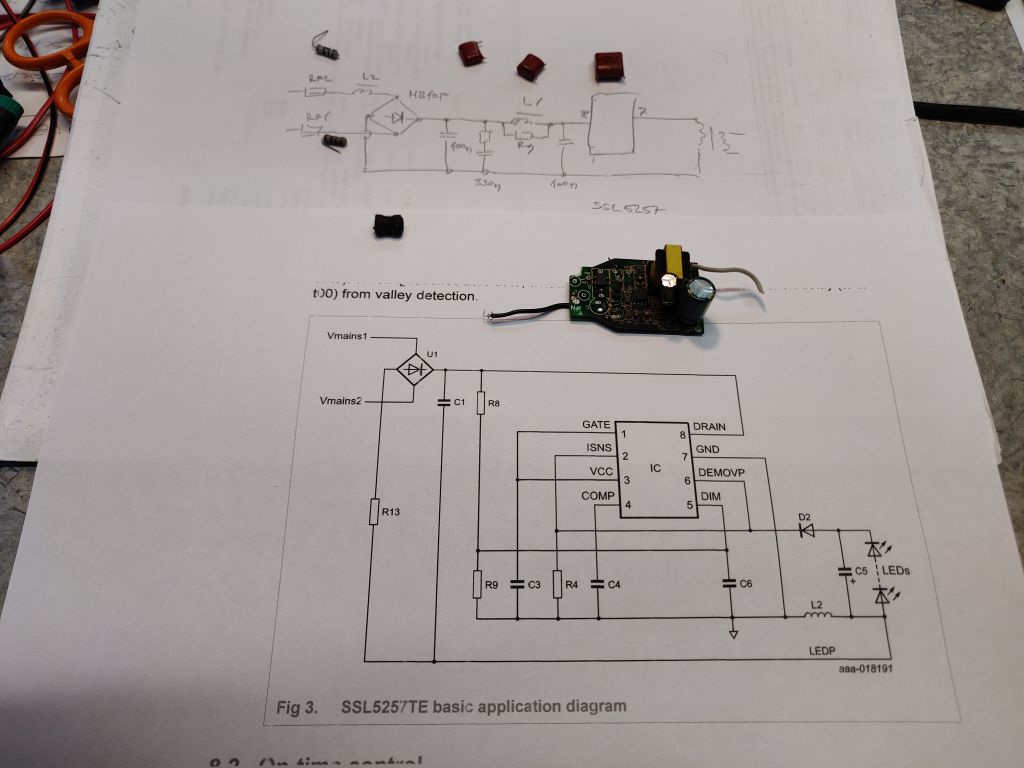 Varsinainen havainto on, että kehitystä tapahtuu näissäkin. Kontrolleri on SSL5257 buck/boost tyyppinen regulaattori. Tällainen kytkentä ottaa virta koko verkkojakson ajan eli sisältää automaattisesti tehokertoimen korjauksen (PFC:n). Muutenkin inputissa oli ihan hyvin EMI suodatintavaraa ja sulakevastukset.