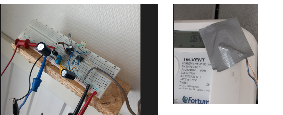 Tuo talon mittarin vilkkuva valo (1000pulssia per kWh) jäi kiinnostamaan sen verran, että kyhäilin eilen yön tunteina proton, jolla voin saada ledin vilkkumisen näkymään jännitteenä. Varmaankin näitä kytkentöjä löytyy netistä, mutta oli mielenkiintoisempaa kokeilla ja keksiä. Ohessa protokytkis ja proto asennettuna. V1 pulssigenis on vain microcap simulaatioiden vuoksi. VAlovastus käytännössä alkaa johtamaan mittarin led-valon välkähtäessä.