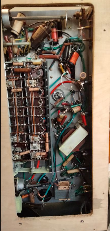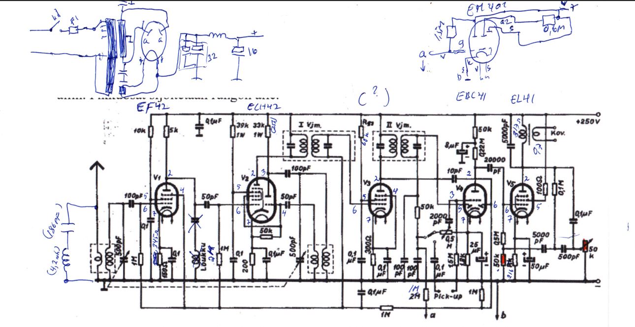 Mielenkiintoinen kapistus varmaan vuosilta 1950-52, putket voisivat olla: EF41 ECH42 E?F42 EBC41 EF41 EM4 AZ1, 7 kpl.