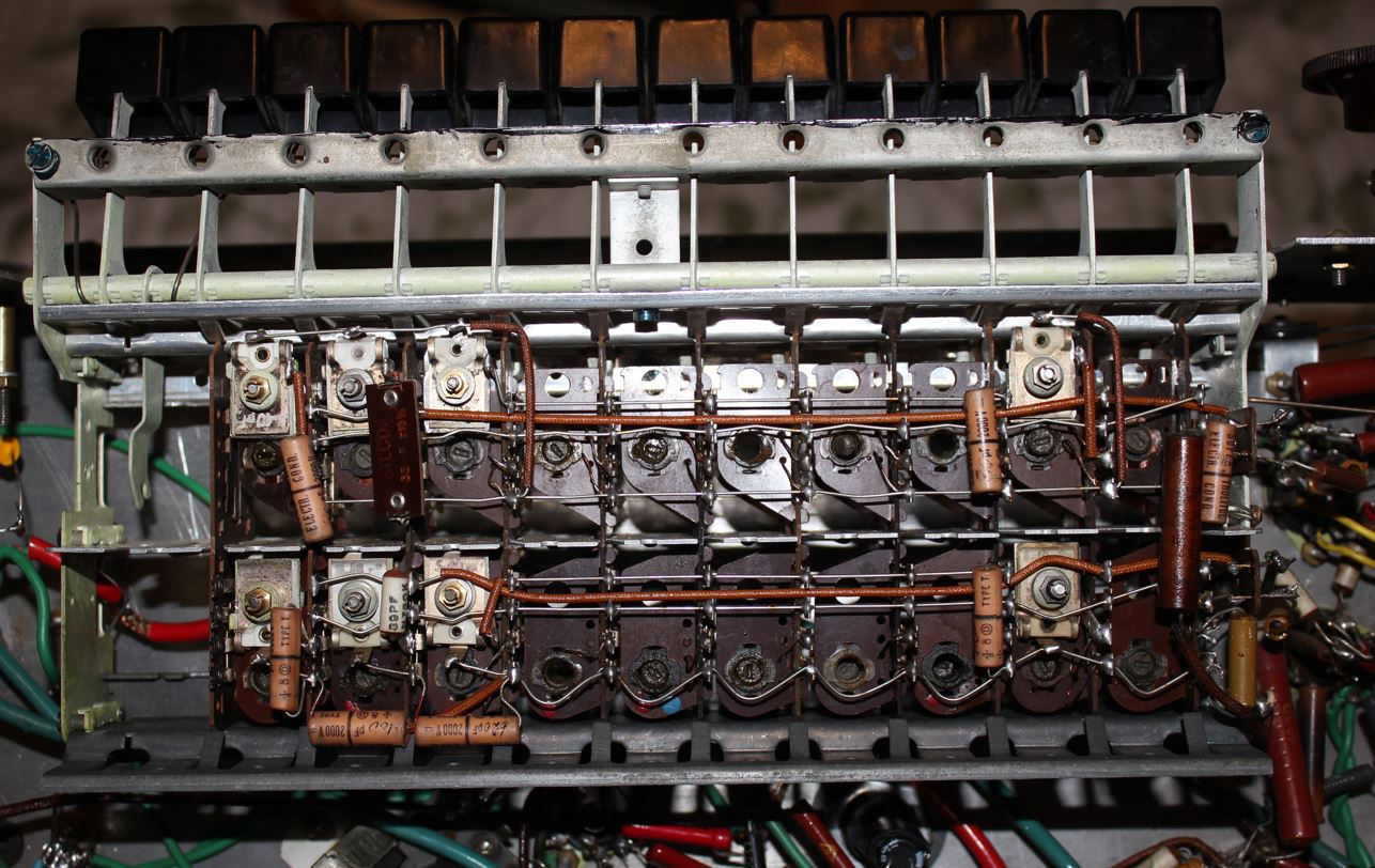 Kuva kelasarjasta altapäin. Oikeassa reunassa päädyssä piirikaavion mukaiset numekontaktit.