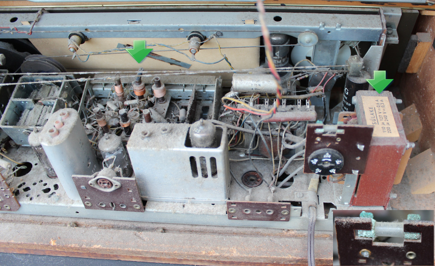 Vielä täytyy asteikkolamput hommata, kaaviossa on merkitty 7 V E10, mutta radiossa oli 6,3 V:set.