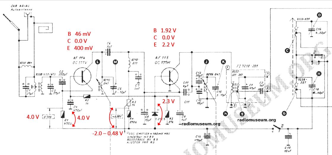 Saako mitatuista jännitteistä vinkkiä eikö oskillaattori värähtele vai onko jompikumpi trankuista rikki?