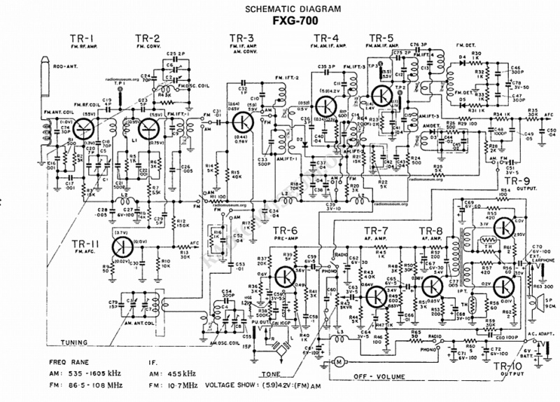 Hei. Sain mykän pienen Sharp FXG-700 matkaradion 60 luvulta jossa myös vielä pienempi levysoitin. Sain vahvistinpuolen kuntoon. 2 viallista transistoria ja elkot vaihdoin koko radioon. Olivat harmaita muovikuorisia Hitachin valmisteita. Muutamissa oli muovikuori halkeillut päältä. Levysoitin toimii hienosti ja oikealla nopeudella. Radiostakin rupesi kuulumaan jotain eli 1 kanava enemmän tai vähemmän huonommin kuuluu yli koko aaltoalueen. Säätökonkka tuntuu liikkuvan normaalisti. Vaihdoin Tr1 transistorin kun sattui vaihdokki olemaan. Ei vaikutusta. Ehjä oli mittauksen mukaan entinenkin. Mistähän kannattaisi aloittaa vianetsintä. On todella tiiviisti osat pakattu ja piirilevy kauttaaltaan tinattu. En ole tämmöisestä viasta ennen kuullut. Liitteenä kytke täkaavio.