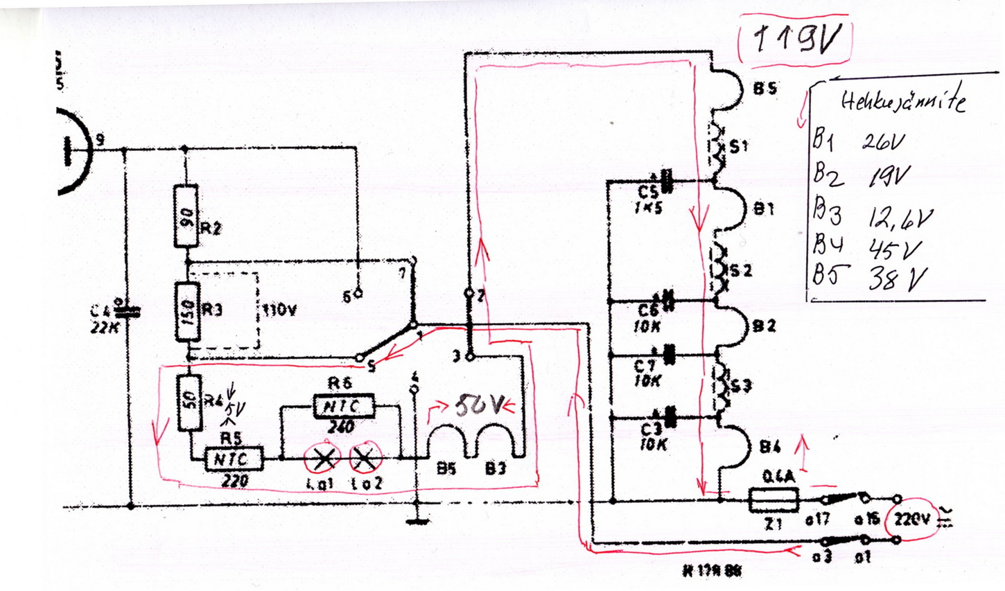 Kytkentäkaavio virtalähdeosassa on  kytkentä 220V jännitteelle valittuna. Liitekuvassa on hehkuketju selvennetty punaisella apuviivalla.