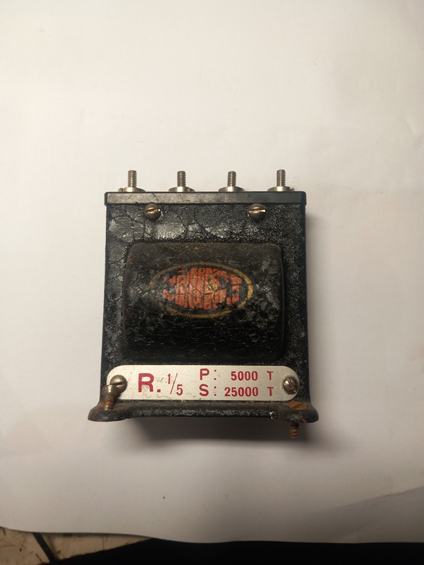 Tuo musta 'muuntaja' ei vastusmittarilla mitaten ole pelkkä muuntaja tai siellä on toinen käämi poikki. kahden ruuvin välilä on 800ohm. Muuten vastus ruuvien välillä on ääretön.