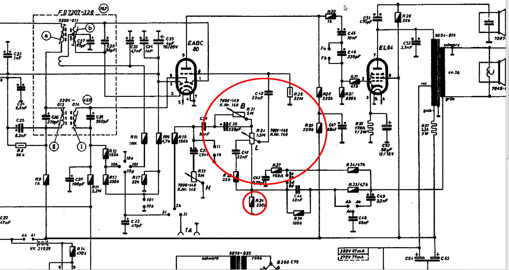 Grundig 1099 ja oheisen huonon kaaviokuvan mukainen äänipääteaste; äänenvoimakkuus ei suostu menemään läheskään nolliin vaan jää minimissäänkin häiritsevän suureksi. L-potikan keskiliu'ulta mitattu minivastusarvo runkoon on 360 ohmia, kun kaavion mukaan siellä olisi 330 ohmin vastus runkoon minimiasennossa. Ja mikä merkillisintä, jos maadoittaa EABC80 triodin hilan (pinni 8) äänenvoimakkuus vielä jopa kasvaa. Mikähän ilmiö tämä nyt mahtaa olla ?