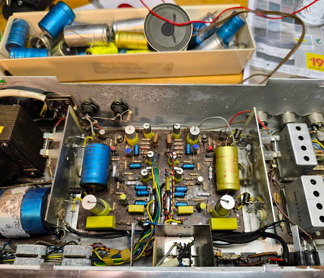 Kuva laitteesta. Ai niin. Yhden konkan jouduin vaihtamaan. Onneksi löytyi sopiva hyllystä 2200 uF, entinen oli 2000 uF mutta sen arvo oli tosiiaan hypännyt sfääreihin.